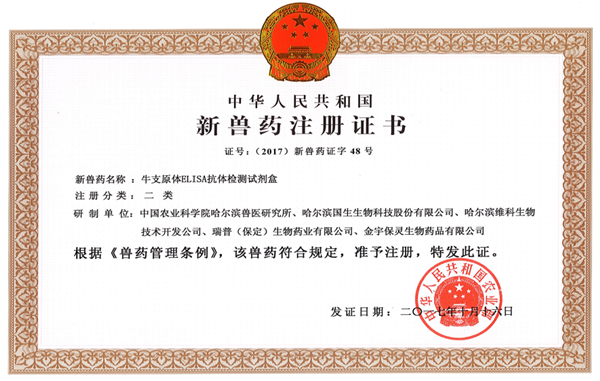 据农业部发布的第2490号公告,由中国农业科学院哈尔滨兽医研究所(以下简称“哈兽研”)、哈尔滨国生生物科技股份有限公司(动物用生物制品国家工程研究中心,以下简称“国生生物”)、哈尔滨维科生物技术开发公司、瑞普(保定)生物药业有限公司和金宇宝灵生物药品有限公司五家单位联合研发的牛支原体ELISA抗体检测试剂盒,获批新兽药注册证书((2017)新兽药证字48号)。该产品由哈兽研辛九庆研究员为首席科学家的支原体病团队研制,由国生生物承担该产品的相关孵化及新兽药注册工作。